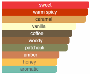 Café, Pachulí, Vainilla, Haba Tonka, Benjuí, Ámbar, Sándalo y Almizcle